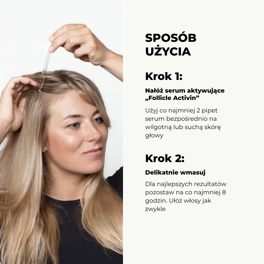 Nasze serum FOLLICLE ACTIVIN zostało opracowane przez zespół ekspertów w celu ograniczenia wypadania i przerzedzania włosów przy jednoczesnym stymulowaniu mieszków włosowych dla szybszego wzrostu włosów. Serum zostało stworzone przy użyciu specjalnej technologii, która pomaga przywrócić funkcję mieszków włosowych. Działa bezpośrednio, dostarczając skórze głowy i włosom niezbędne składniki odżywcze.